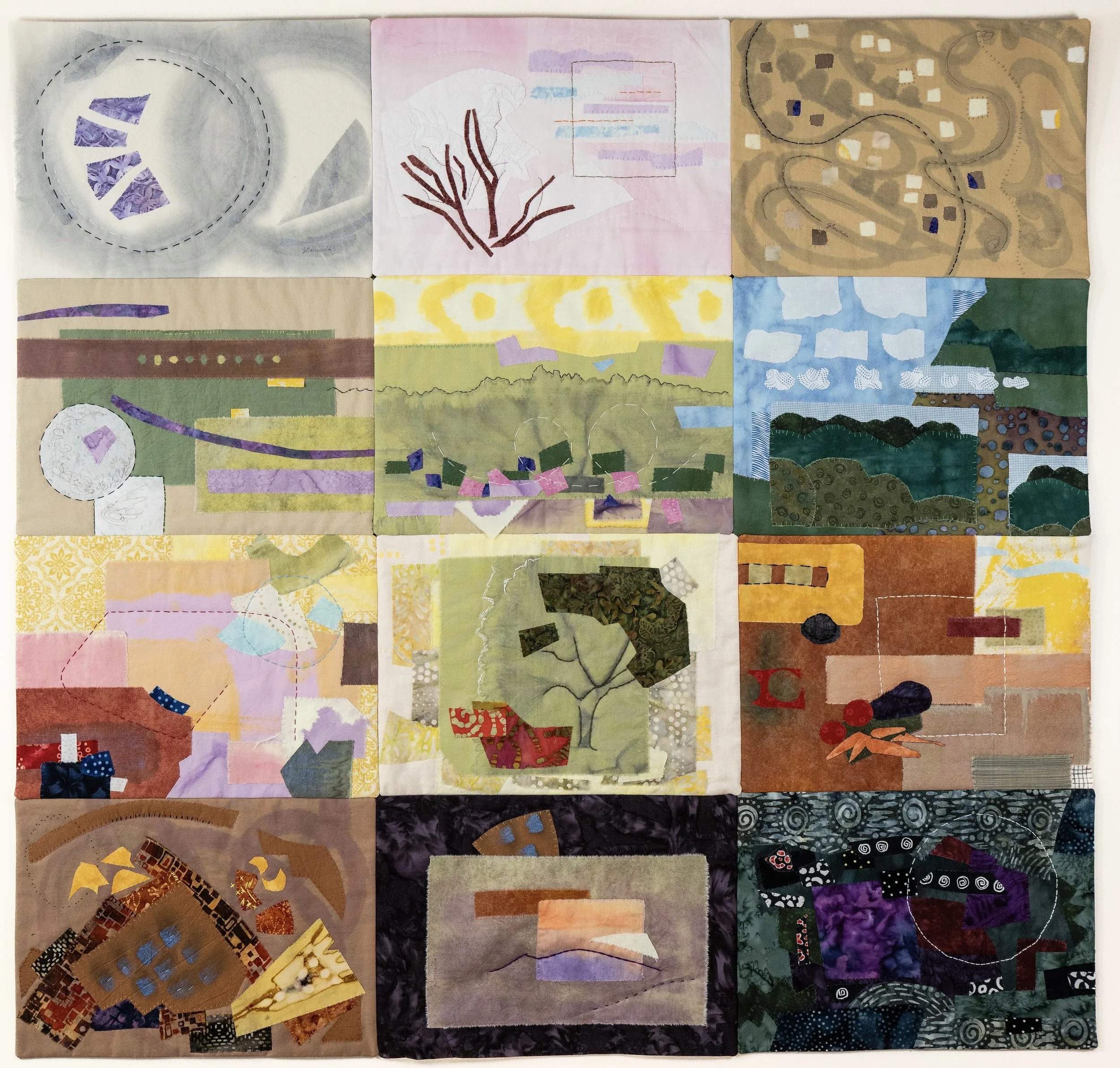 I did not have much artwork available that fit the requirements, so I made a new piece by reusing older pieces. Most of these older 10” X 14” abstract quilts, representing months of the year, were created in 2016 and 2017. The months of April and September had sold long ago, so I had to make new versions for these months. Then, by hand, I stitched all twelve pieces together on the back side, using embroidery floss and a criss cross stitch. I created a new sleeve.