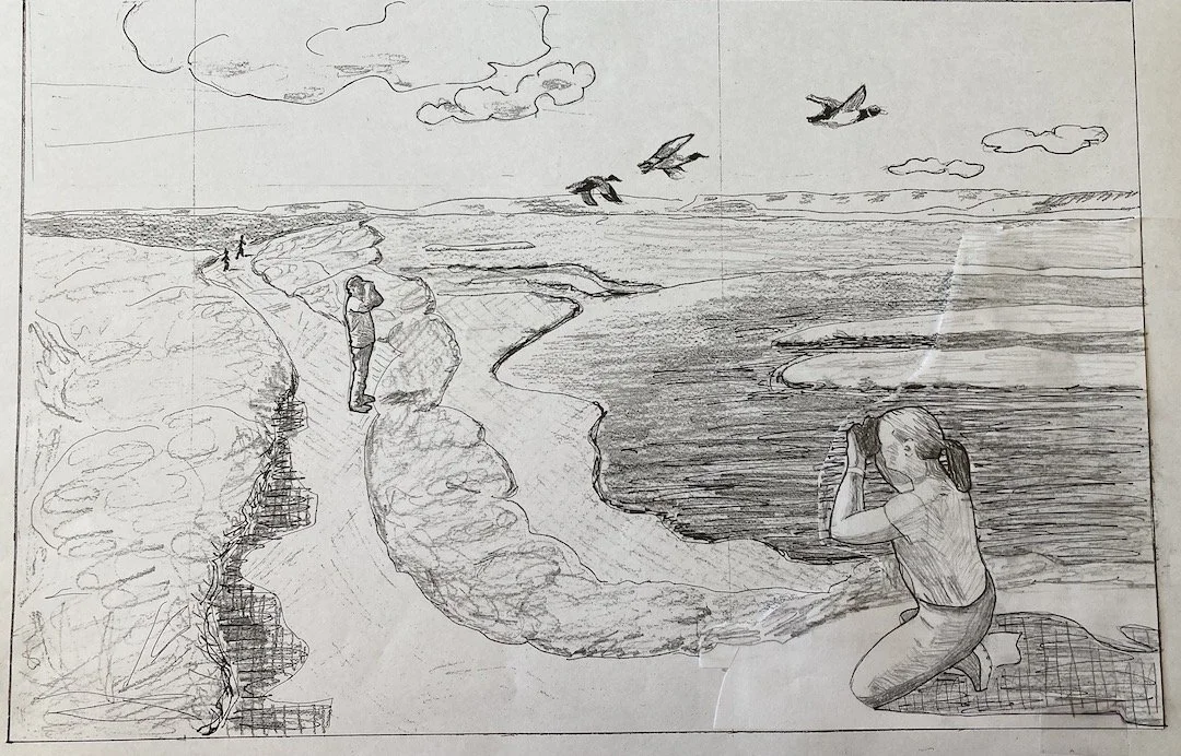 I am in my garden a little less right now and in my studio a little more. That is because I have a work deadline for a large commission. The assignment I was given almost a year ago was to create two designs that included people enjoying the outdoors, kayakers or canoers, and ducks(!) in a place recognizable to locals. Although my first design was beautiful, with the reflection of a boat and people and a mama duck hidden in the foreground reeds, it was also fictional. It turns out that there is no such place locally where people enjoying nature can use a canoe or kayak. The committee wisely chose my second design which is inspired by the Bolsa Chica State Reserve, a spot with many walking trails, wetlands, and terrific bird watching (including ducks). The working title is Bolsa Chica Trails.